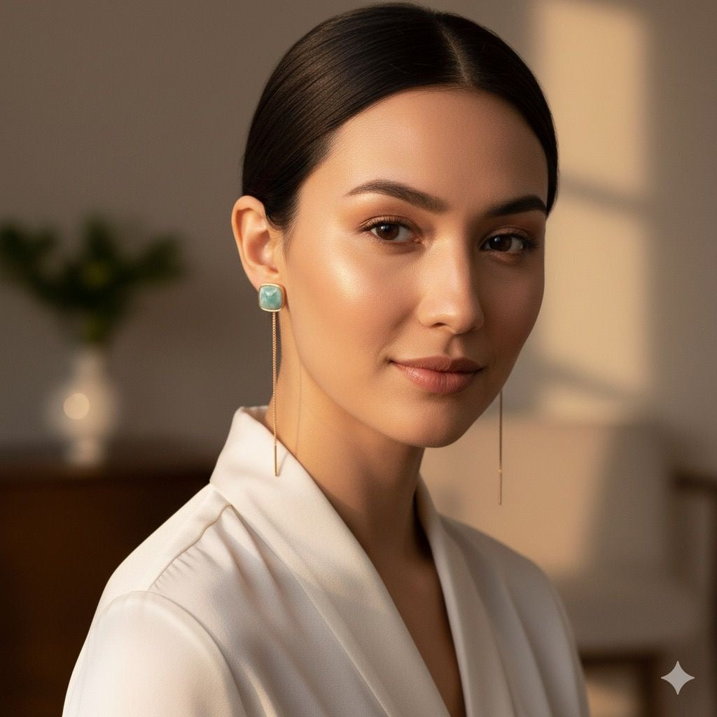 Elegant and minimal, these Amazonite threader earrings are crafted in 925 sterling silver with a polished finish. The soft aqua stones add a calm, modern touch — perfect for everyday wear or special occasions. Lightweight, comfortable, and handcrafted with care.